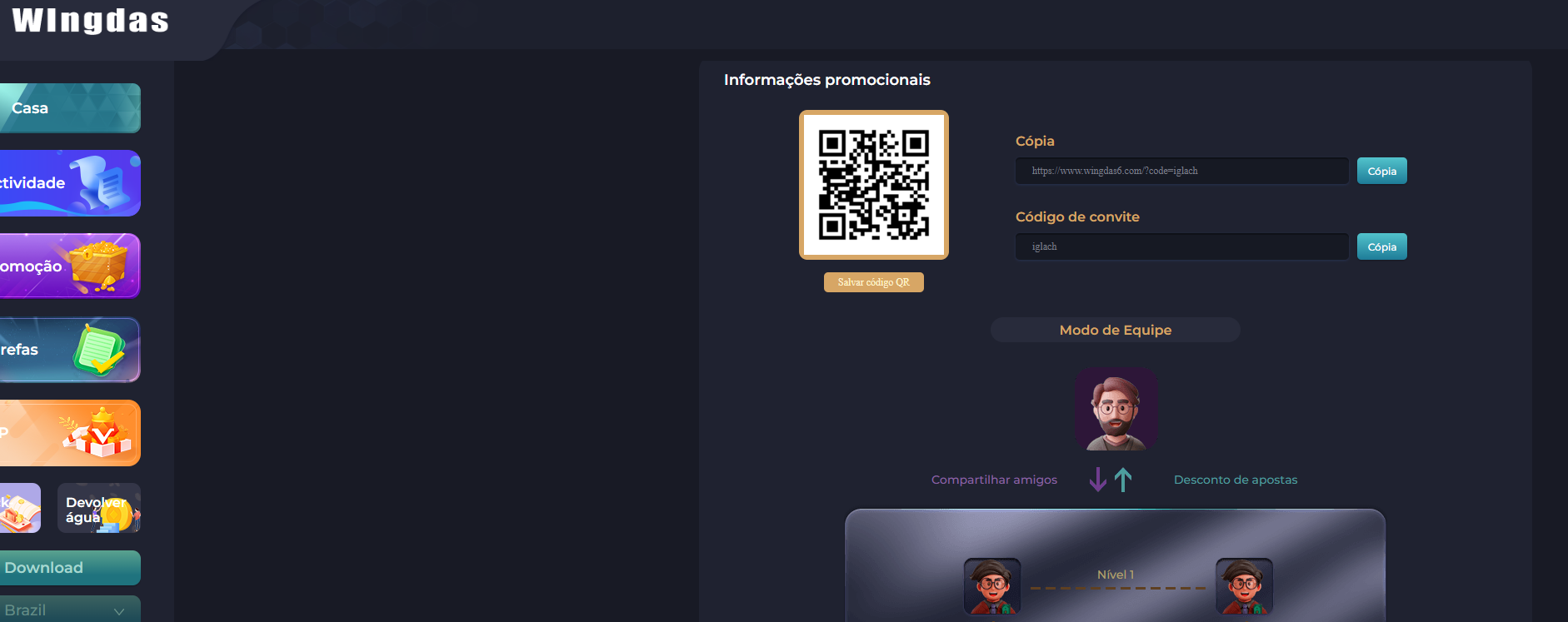 Link de cadastro com o código aplicado: https://www.wingdas6.com/?code=iglach